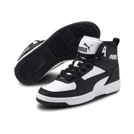 Młodzieżowe buty sportowe Puma Rebound Joy Jr to inspirowane retro stylistyką fantastyczne wysokie sneakersy z lifestylowym fasonem. Nawiązujące designem do koszykarskiego dziedzictwa obuwie to znakomite buty do aktywnego spędzania czasu, ale równie dobrze możesz w nich chodzić do kina, do pracy czy na imprezę. Młodzieżowe sneakersy Puma zostały wykonane z trwałej ekoskóry. Posiadają amortyzującą wkładkę SoftFoam+ oraz wyprodukowaną z wysokogatunkowego tworzywa podeszwę zewnętrzną zapewniającą doskonałą trakcję. Przyczepność do podłoża to jedna z najważniejszych cech butów koszykarskich. Gumowa śródpodeszwa zabezpiecza kostki przed urazami, a sznurowane wiązanie dodatkowo zadba o całą stopę. Wygoda i bezpieczeństwo to priorytetowe wartości wysokich butów sportowych Puma Rebound Joy Jr.